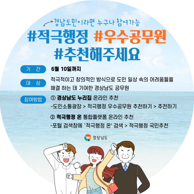 도민 추천은 경남도 누리집 > 도민소통광장 > 적극행정 > 적극행정우수공무원(정책) 추천하기 또는 인사혁신처 적극행정 온 > 적극행정 국민추천에서 6월 10일까지 추천하면 된다.