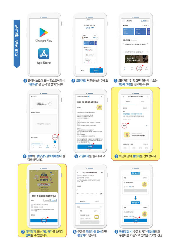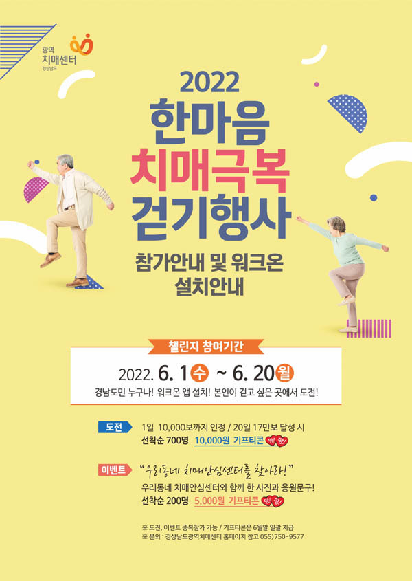참여방법은 휴대폰에 워크온 앱을 설치한 후, ‘경상남도광역치매센터’를 검색한 다음, 행사 커뮤니티에 가입하여 챌린지 등에 참여하면 된다. 1일 최대 10,000걸음을 인정하고, 20일 내 170,000걸음을 달성한 선착순 700명에게는 모바일 상품권을 지급한다.