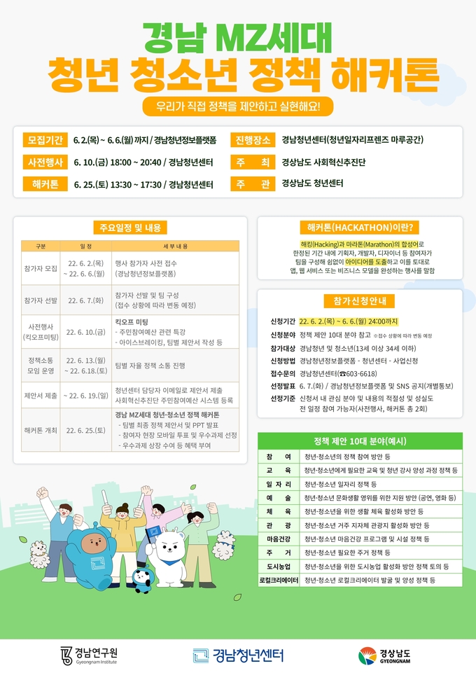 [경남도민뉴스] (재)경남연구원(원장 직무대행 김태영)에서 운영 중인 경남청년센터(센터장 직무대리 박정의)는 도내 청년 및 청소년들의 도정 참여 역량 강화와 정책 참여 환경 조성을 위해 자유롭게 의견을 표출할 수 있는 ‘경남 MZ 세대 청년·청소년 정책 해커톤’을 개최한다고 밝혔다.