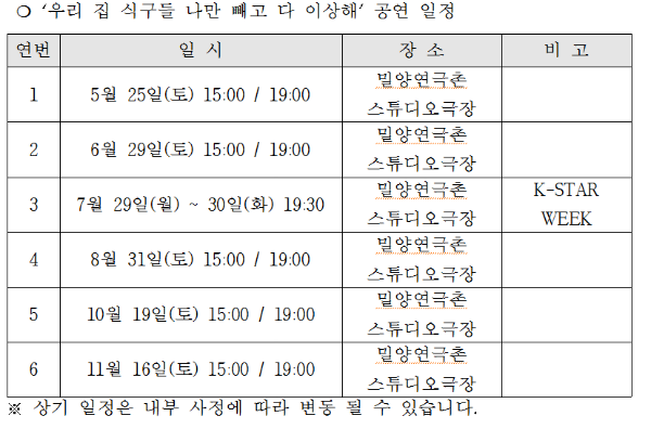 또한, 7월 26일부터 6일간 개최되는 ‘K-STAR WEEK’ 행사에 마당극 ‘깨비랑’, 연극 ‘만만한 인생’과 더불어 ‘우리 집 식구들 나만 빼고 다 이상해’가 주요 공연으로 예정되어 많은 기대를 모으고 있다. K-STAR WEEK는 7월 26일부터 8월 6일까지 열리는 밀양의 대표 예술축제인 밀양공연예술축제와 연계해 진행된다.