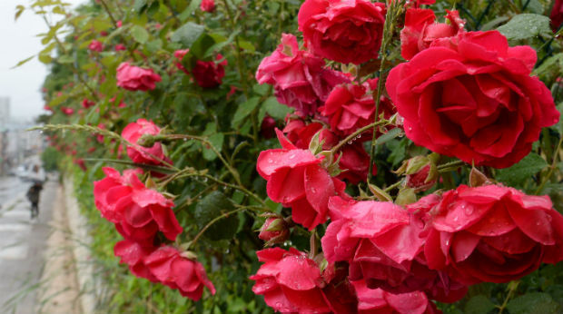 27일 경남 거창군 거창읍 인근 한 주택가에 꽃망울을 터트린 장미꽃이 봄비를 한껏 머금고 있다.