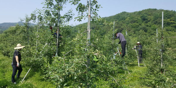 3일 농업기술센터 직원 12명이 고제면 궁항리 소재 박순규 농가(면적 2ha)를 찾아 사과나무 적과작업에 나섰다.
