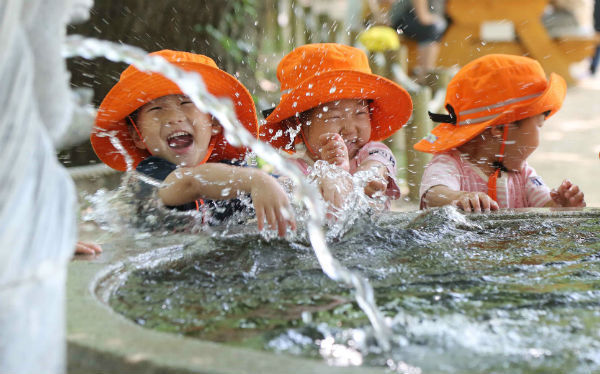 폭염주의보가 발효중인 5일 경남 함양군 함양읍 상림공원에서 숲 체험 나온 성민어린이집 아이들이 물놀이를 즐기며 더위를 식히고 있다.