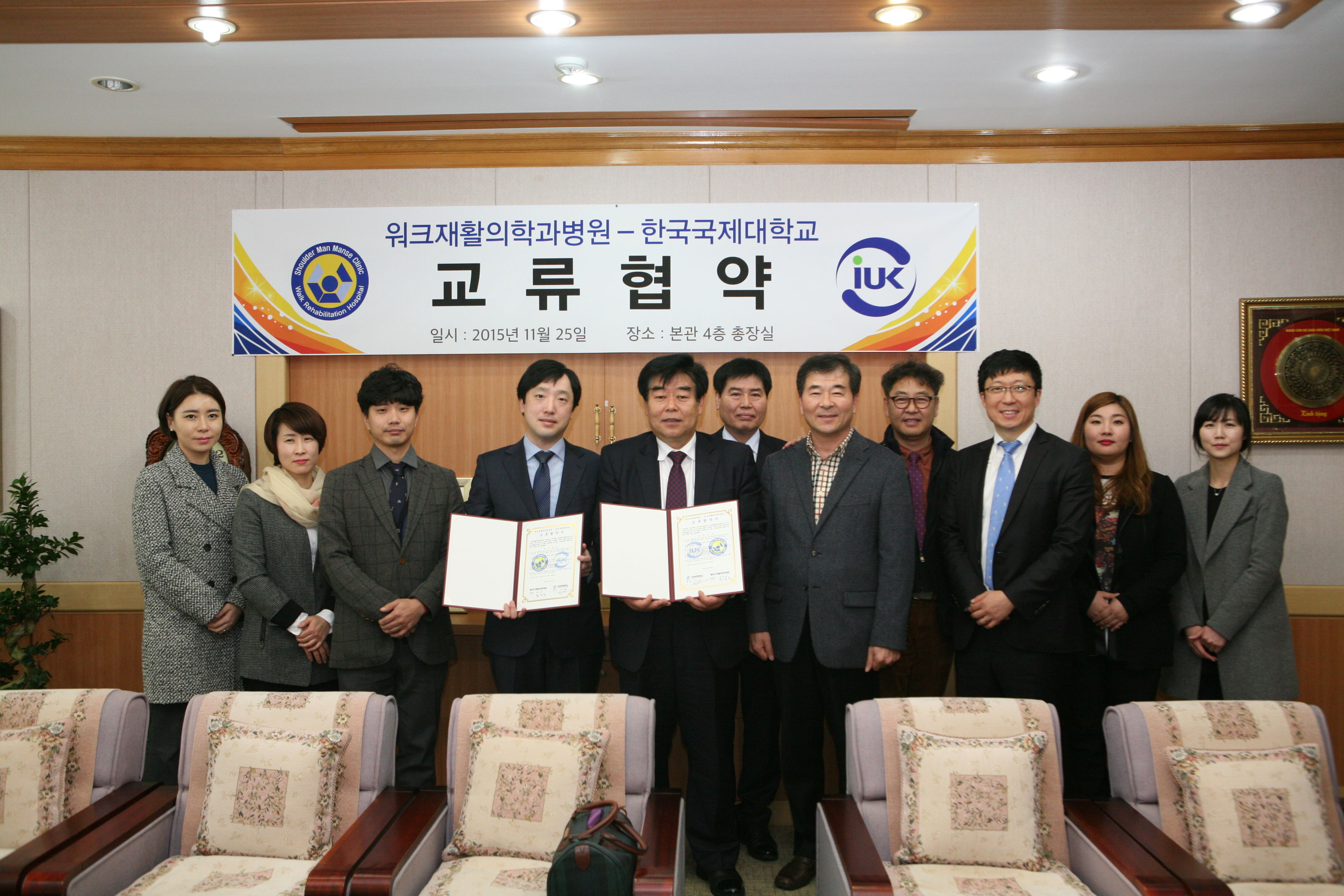 한국국제대학교 대외협력팀은 지난 10월 보건계열 교수들과 학생20여명이 병원을 방문하여 시찰하고 돌아왔고 이후 지속적인 관계를 유지해 오다 이번에 상호교류협약식을 체결했다고 밝혔다. 이에 따라 물리치료학과 등 의료보건계열 학과는 이번 겨울부터 워크재활의학과병원에서 인턴십 및 임상실습을 실시하게 됐다.