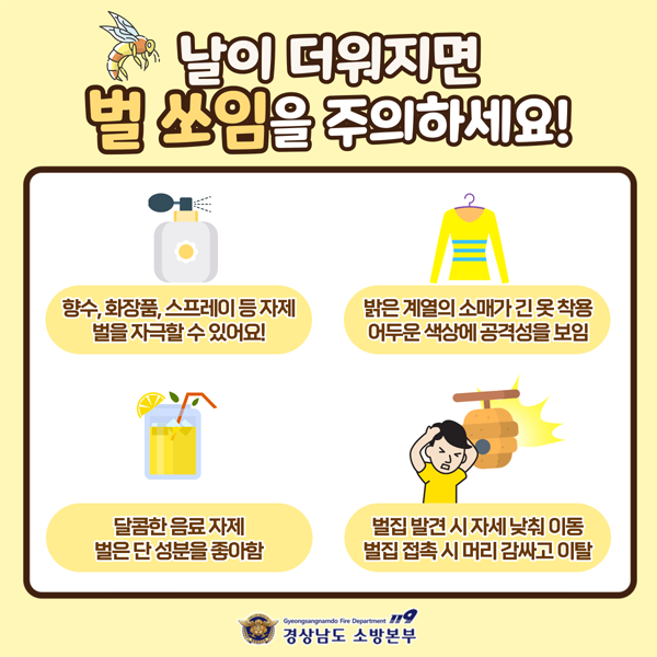 한편 도 소방본부는 도민들이 벌 쏘임 예방 행동요령을 일상에서 자주 접할 수 있도록 경상남도 사회관계망서비스 및 도내 대형 전광판, 버스 모니터 등에 안전 행동 요령을 지속 제공하고 있다.