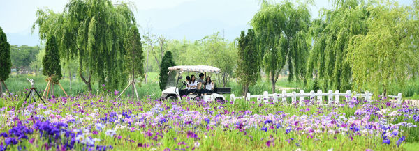 19일 경남 거창군 남상면 거창창포원에 관광객들이 자줏빛깔 보라색 창포 꽃길 사이를 전동 카트기를 타고 지나가고 있다.