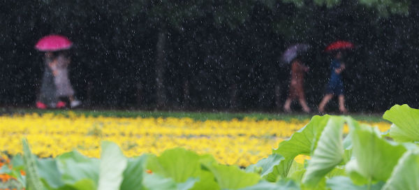 올해 첫 장맛비가 내리는 26일 오전 경남 함양군 상림공원을 찾은 관광객들이 우산을 쓴 채 걷고 있다.