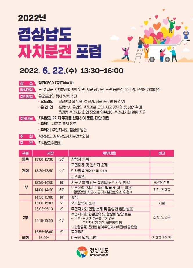 [경남도민뉴스] 경상남도는 ‘2022년 상반기 경상남도 자치분권 포럼’을 오는 22일 오후 창원컨벤션센터에서 실시간 온․오프라인으로 개최한다.