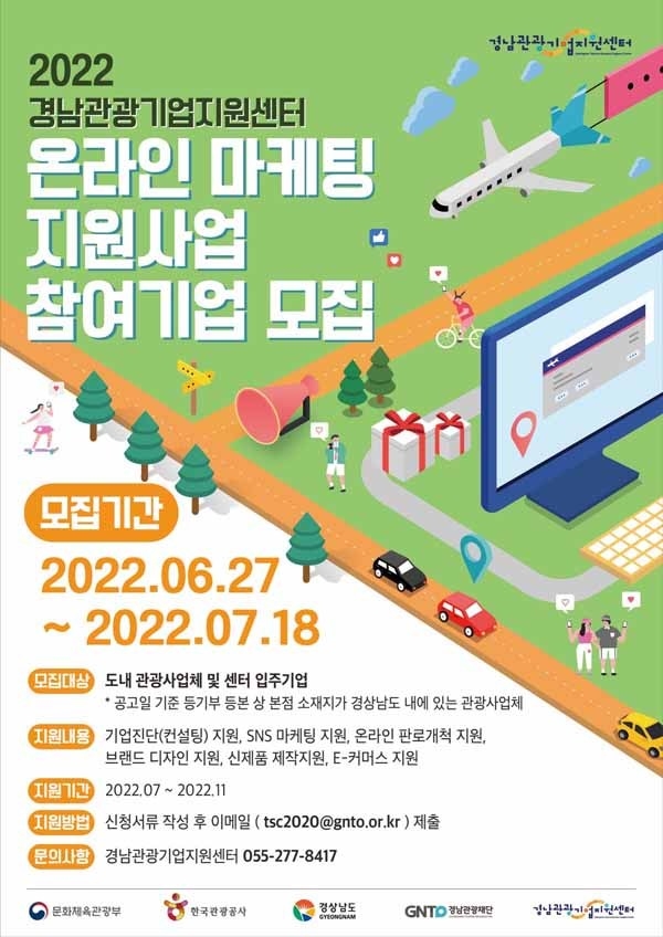 [경남도민뉴스] 경남도는 경남관광재단과 함께 경남관광기업지원센터에서 주최하는 ‘온라인 마케팅 지원사업’ 참가기업을 6월 27일부터 7월 18일까지 10개 내외 기업을 모집한다고 밝혔다.