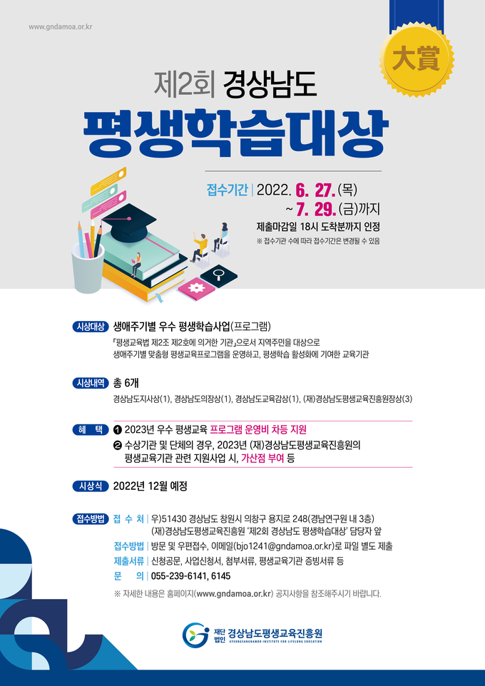 [경남도민뉴스] 경상남도와 (재)경상남도평생교육진흥원(이하 ‘진흥원’)이 오는 7월 29일까지 제2회 경상남도 평생학습대상 수상기관을 공모한다.