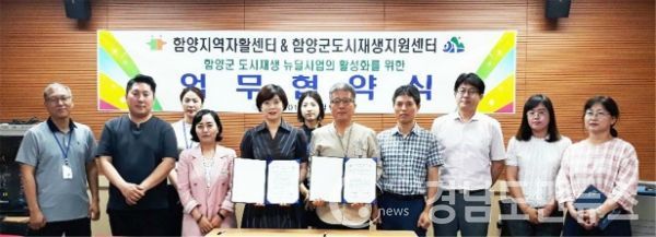 (경남도민뉴스) = 함양군도시재생지원센터와 함양지역자활센터는 지난 8일 도시재생과 계층별 일자리 창출, 사회적 기업 육성과 하반기 인당마을 도시재생뉴딜사업 공모를 위한 업무협약식을 가졌다.