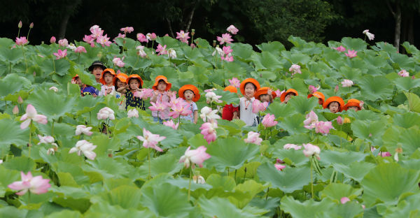 장맛비가 소강상태를 보인 11일 오전 경남 함양군 상림공원 연꽃단지를 찾은 관광객들이 활짝 핀 연꽃을 구경하고 있다.