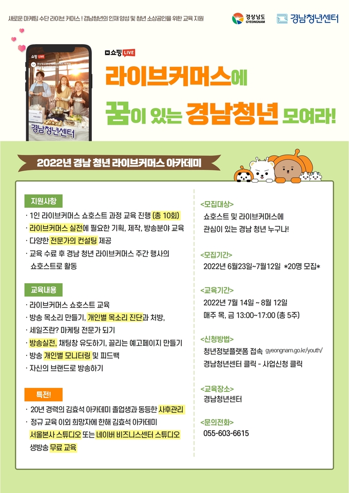 [경남도민뉴스] (재)경남연구원(원장 직무대행 김태영)에서 운영 중인 경남청년센터(센터장 직무대리 박정의)는 경남 청년들을 위한 새로운 일자리 창출 및 경남 라이브커머스 산업의 체계적인 육성을 위해 2022년 청년 라이브커머스 아카데미를 운영한다.