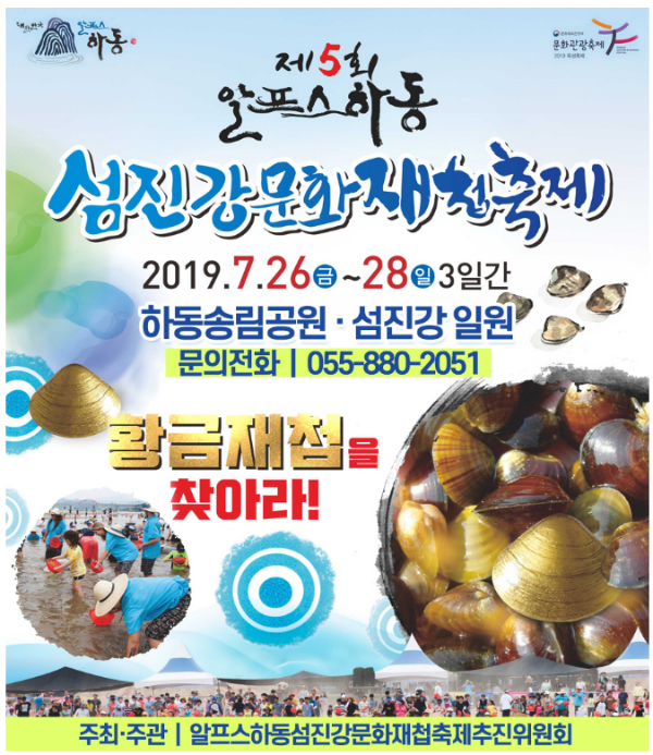 (하동/정범식 기자) = 2019년 문화체육관광부 육성축제로 선정된 우리나라 대표 여름축제 제5회 알프스하동 섬진강문화 재첩축제가 오는 26일 막을 올린다.