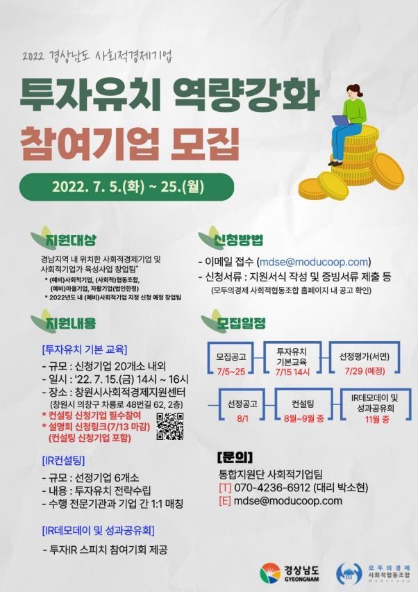 [경남도민뉴스] 경상남도는 도내 사회적경제기업에 투자유치 역량 강화 기회를 제공하기 위해 ‘투자유치 역량강화 및 모의 투자유치 설명회’에 참여할 기업을 오는 25일까지 모집한다.