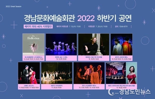 [경남도민뉴스] 경상남도문화예술회관(관장 강동옥)이 2022년 하반기 기획공연을 공개했다. 발레, 음악극, 오페라, 무용, 연극, 콘서트 등 다채로운 장르의 기획공연을 구성해 경남도민들에게 골라보는 재미를 선사할 예정이다. 여기에 최대 40%의 할인과 다양한 혜택을 덤으로 받을 수 있는 기획공연 패키지 상품도 선보여 기대를 모은다.