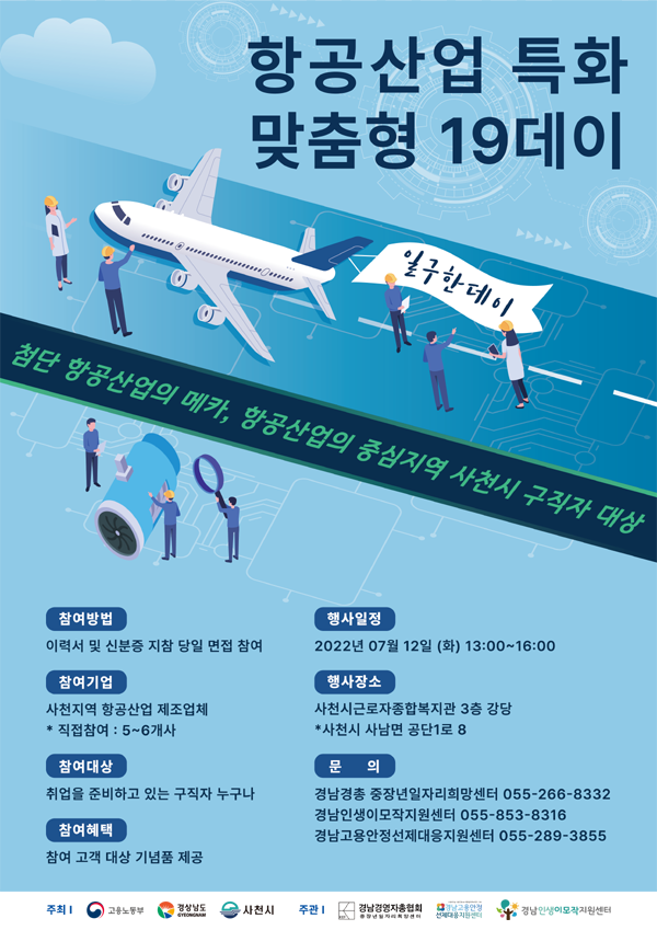 [경남도민뉴스] 경상남도는 고용위기로 어려움을 겪고 있는 사천지역 항공산업체 구인난 해결과 도민 취업을 위해 항공특화 소규모 채용박람회 ‘항공특화 19데이’를 오는 12일 오후 1시에 사천시 근로자종합복지관에서 개최한다.