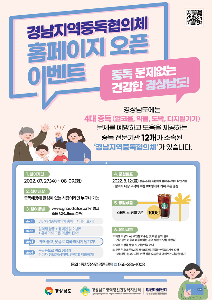 [경남도민뉴스] 경상남도(도지사 박완수)는 경남지역중독협의체 누리집 새 단장을 기념하여 내달 9일까지 ‘중독협의체 퀴즈 풀기’ 이벤트를 진행한다고 밝혔다.