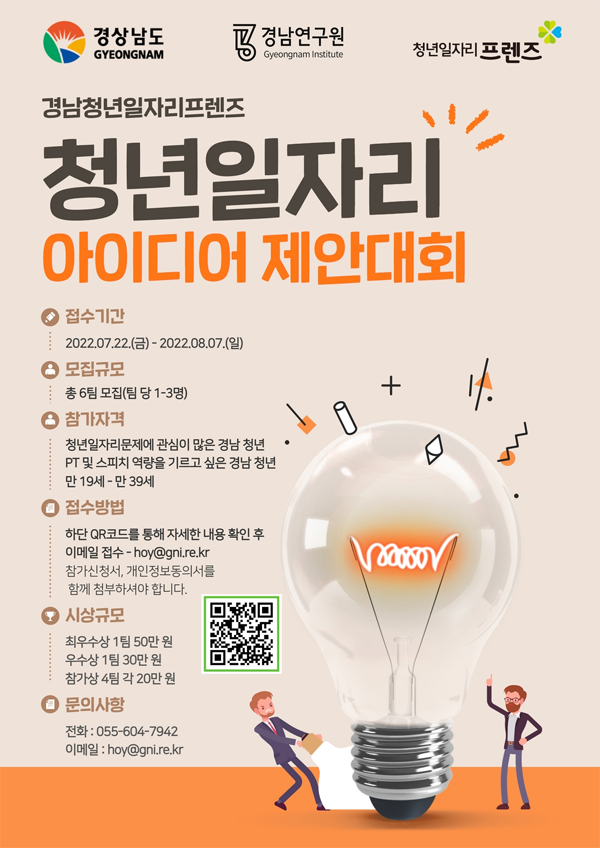 [경남도민뉴스] 경상남도는 청년일자리프렌즈가 7월 22일(금)부터 8월 7일(일)까지 ‘청년일자리 아이디어 제안대회’ 참여청년을 모집한다고 밝혔다.