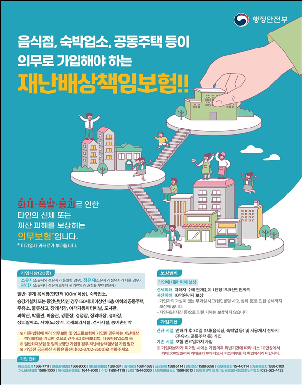 ‘재난배상책임보험’은 화재·폭발·붕괴 등의 사고로 인한 타인의 신체 또는 재산상의 피해를 보상하는 보험으로, 「재난 및 안전관리 기본법」에 따라 2017년 1월 8일부터 시행 중인 의무보험이다.