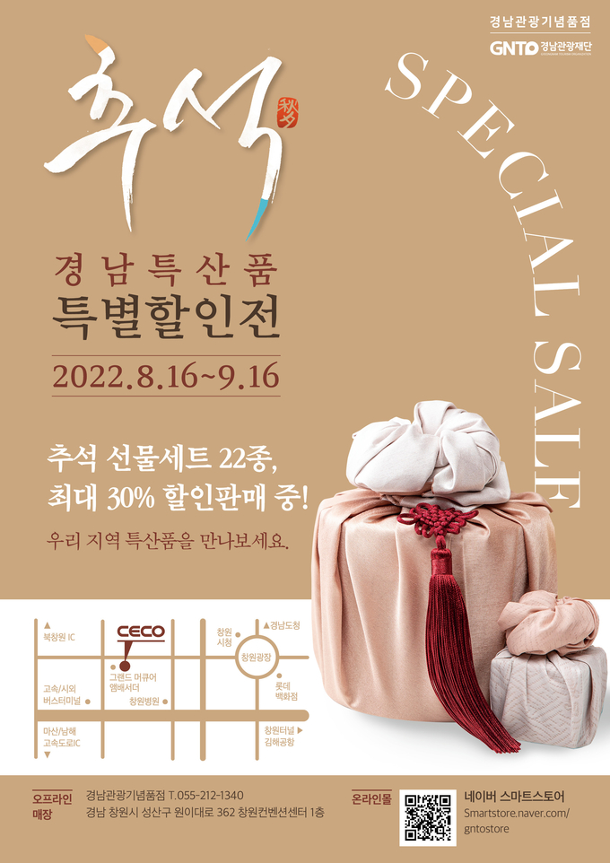 [경남도민뉴스] 경상남도와 경남관광재단이 운영하는 경남관광기념품점(이하 기념품점)은 2022년 민족 대명절 추석을 맞이하여 8월 16일(화)부터 9월 18일(일)까지 특별 할인행사를 진행한다고 밝혔다.