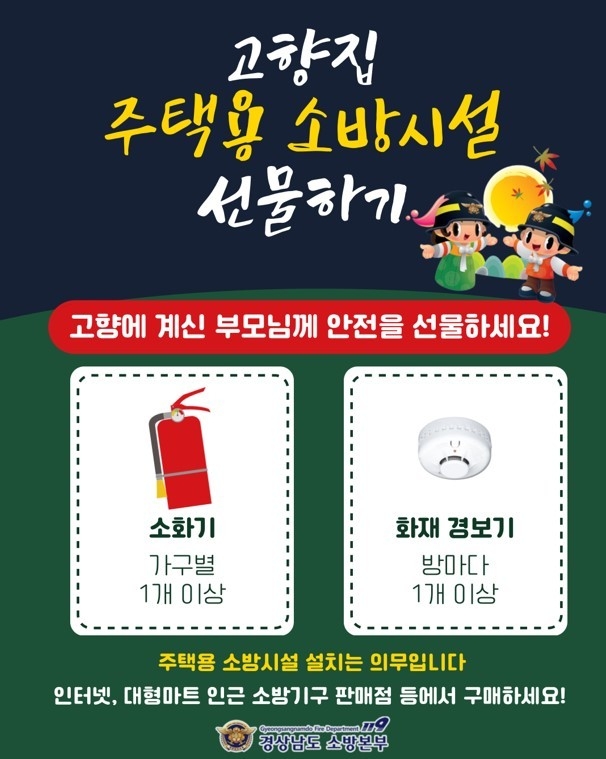[경남도민뉴스] 경상남도 소방본부(김종근 본부장)는 다가오는 추석 명절을 맞아 고향집에 주택용 소방시설을 선물해 화재를 예방할 수 있도록 도민들의 적극적인 동참을 당부했다.