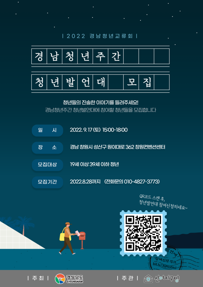 [경남도민뉴스] 경상남도는 9월 17일(토) 창원컨벤션센터에서 개최되는 ‘경남청년주간’ 행사 기간 중 경남청년교류회(이하 ‘교류회’) 프로그램에 참가할 청년발언자를 모집한다.