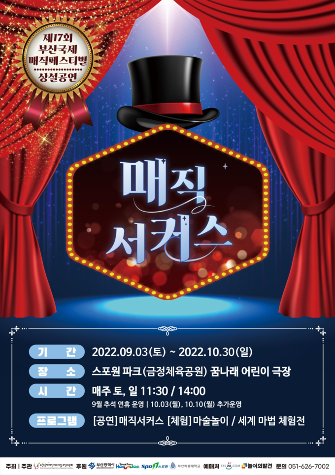 [경남도민뉴스] 부산시(시장 박형준)와 (사)부산국제매직페스티벌조직위원회(집행위원장 강열우)는 오는 9월 2일부터 10월 30일까지 매주 주말마다 스포원 파크 꿈나래 어린이극장에서 ‘1년 내내 마술로(路)’ 프로그램으로 <매직 서커스>를 개최한다고 밝혔다.