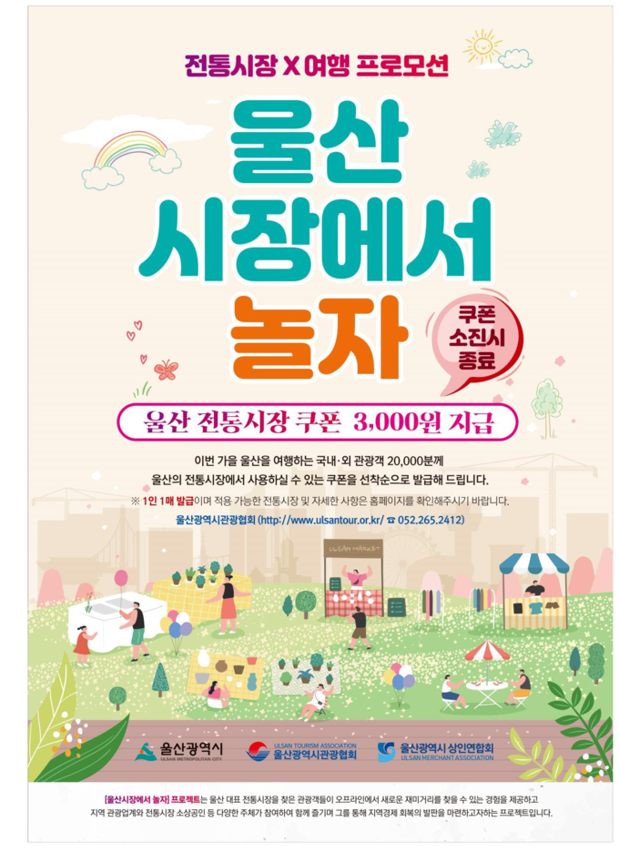쿠폰은 9월 6일부터 전통시장 방문을 포함하는 울산여행상품 이용 단체 관광객과 관내 숙박업체를 이용하는 개별 관광객 등 2만 명에게 3,000원 권(1인 1매)을 선착순 배부한다.