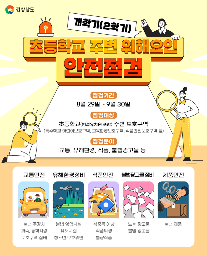 [경남도민뉴스] 경상남도(도지사 박완수)는 새학기를 맞아 어린이 안전사고 예방을 위해 도내 510개 초등학교 주변 위해요인에 대한 안전 점검 및 단속에 나섰다.