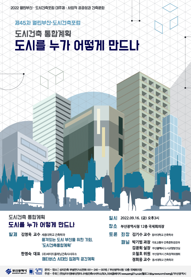 행사는 김영욱 세종대학교 건축학과 교수의 ‘품격있는 도시 부산을 위한 도시건축통합계획’, 한영숙 ㈜싸이트플래닝건축사사무소 대표의 ‘메타버스 시대에 입체적 도시건축계획’ 발제, 김광회 부산시 도시균형발전실장, 박기범 국토교통부 건축문화경관과장, 오철호 부산시 건축정책위원회 위원, 정희웅 동서대학교 건축학과 교수가 참여하는 전문가 토론 순으로 진행된다.