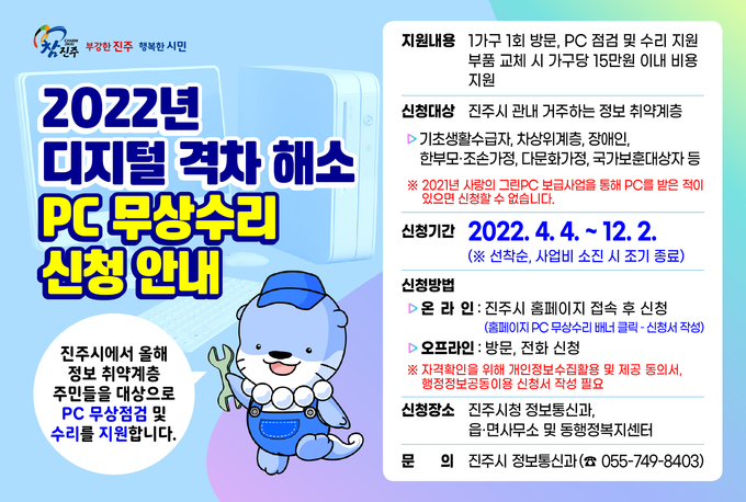 진주시는 코로나19의 장기화로 가정 내 컴퓨터 사용이 증가함에 따라 지난 4월부터 관내에 거주하는 정보취약계층(기초생활수급자, 차상위계층, 장애인, 한부모·조손가정, 국가보훈대상자, 북한이탈주민 등)을 대상으로 컴퓨터를 무상 점검·수리하는 사업을 시행하고 있다.