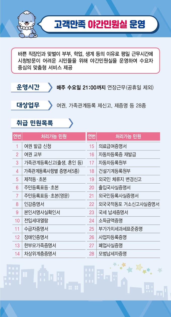 ‘수요야간민원실’은 바쁜 직장인과 맞벌이 부부, 학업, 생계 등을 이유로 평일 근무시간에 시청 방문이 어려운 시민들의 불편을 해소하기 위해 여권민원 및 인감증명 등 민원여권과에서 발급 가능한 즉결 제증명을 제공한다. 운영시간은 수요일 오후 9시까지이다. 단, 수요일이 공휴일인 경우 운영하지 않는다.
