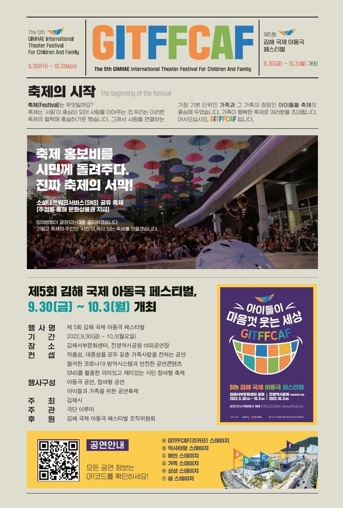 [경남도민뉴스] 제5회 김해국제아동극페스티벌이 오는 30일부터 10월 3일까지 김해서부문화센터와 진영역사공원 야외공연장에서 ‘아이들이 웃는 세상’을 주제로 개최된다.