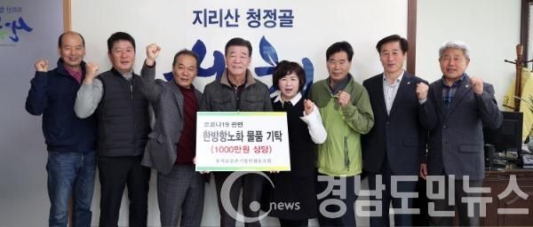 산청군 ‘동의보감촌기업인협동조합(회장 장정옥)’이 31일 산청군청을 찾아 1000만원 상당의 기부물품을 전달했다.