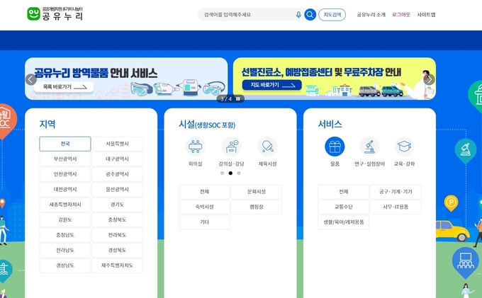 ‘공유누리’는 2020년 3월부터 제공하는 서비스로, 전국 지자체와 공공기관의 시설과 물품 등 국민이 사용할 수 있는 공공개방자원을 검색하고 이용예약과 결제까지 할 수 있는 온라인공공자원 공유포털이다.