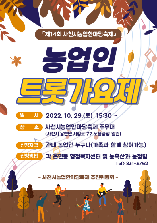 27일 시에 따르면 사천시농업한마당축제추진위원회 주최로 오는 10월 29일 오후 3시 30분 사천시청 노을광장 주무대에서 ‘농업인 트롯가요제’를 연다.