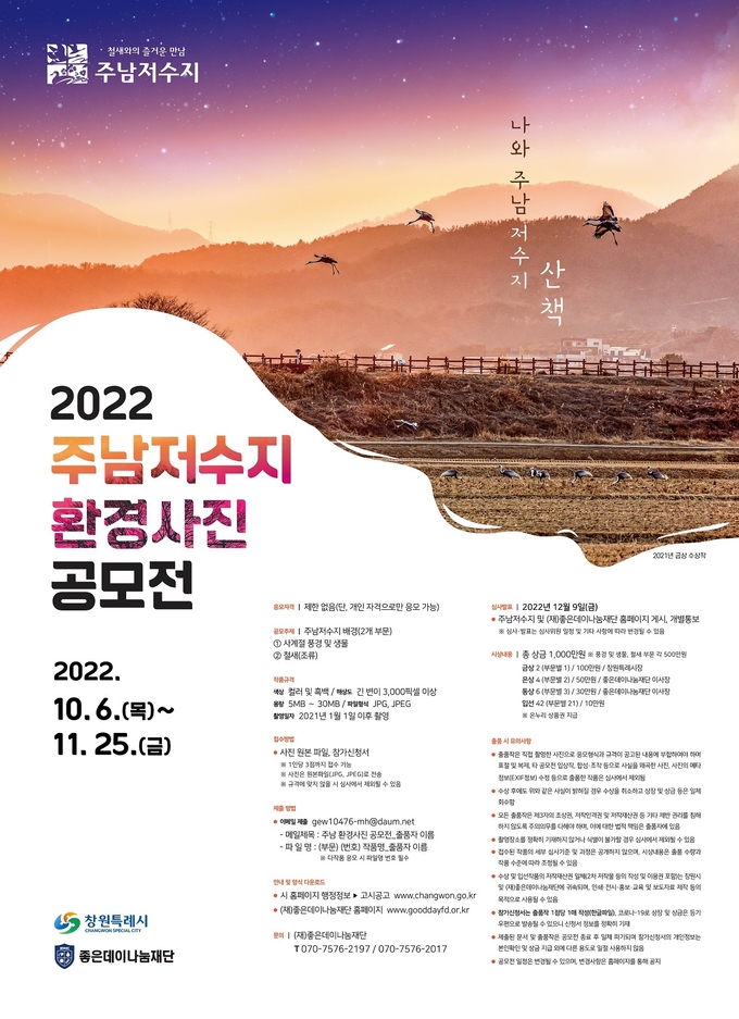 이번 사진 공모전은 주남저수지의 우수한 자연환경 홍보 및 생태관광 활성화를 위하여 개최하는 것으로, 올해는 지난 9월 19일 조명래 창원특례시 제2부시장과 최재호 (재)좋은데이나눔재단 이사장이 업무협약을 체결하여 우리시와 (재)좋은데이나눔재단의 공동주최로 진행된다.