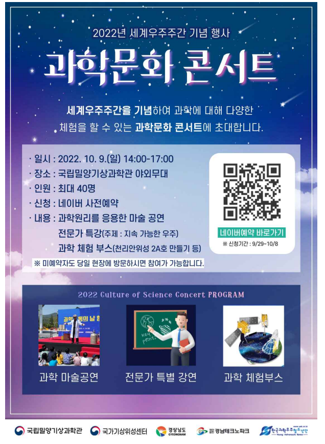 [경남도민뉴스] 부산지방기상청(청장 김현경)과 경상남도(도지사 박완수)는 ’22년 세계우주주간*을 맞이하여 10월 9일 일요일 오후 2시부터 오후 5시까지 국립밀양기상과학관 야외무대에서 과학문화콘서트를 개최한다.