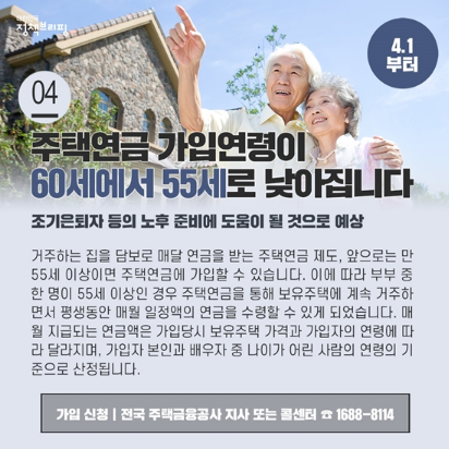 이에 따라 부부 중 한 명이 55세 이상인 경우 주택연금을 통해 보유주택에 계속 거주하면서 평생동안 매월 일정액의 연금을 수령할 수 있게 되었습니다.
