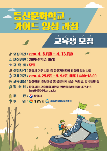 한편 등산문화학교는 2020년 5월부터 10월까지 운영예정이며 초․중․고 학생을 30명 모집 후(5월 모집 예정) 통영시 관내 욕지면(연화우도길), 한산면(대매물도 둘레길), 사량면(고동산 둘레길), 미륵산, 제석봉, 시루봉 등에서 현장 운영한다.