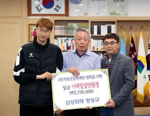 (재)하동군장학재단(이사장 이양호)은 삼성화재 정성규 선수가 지난 10일 군수 집무실을 찾아 하동의 미래 인재육성에 써달라며 장학기금 270만원을 기탁했다고 13일 밝혔다.