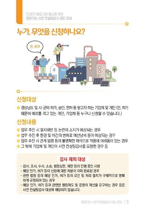 이와 같이 경남도는 기업체, 단체, 기관 등의 애로사항을 해소하기 위해 현장 컨설팅을 추진하고 사전 컨설팅감사 제도에 대한 홍보활동을 펼치고 있다.