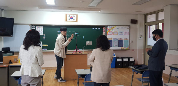 원격수업을 참관한 이정미 장학사는 “여러 수업을 참관했지만 쌍방향 수업 도구를 활용하면서 실제 수업처럼 서서 수업 하는 장면이 인상적”이라고 소감을 전했다.