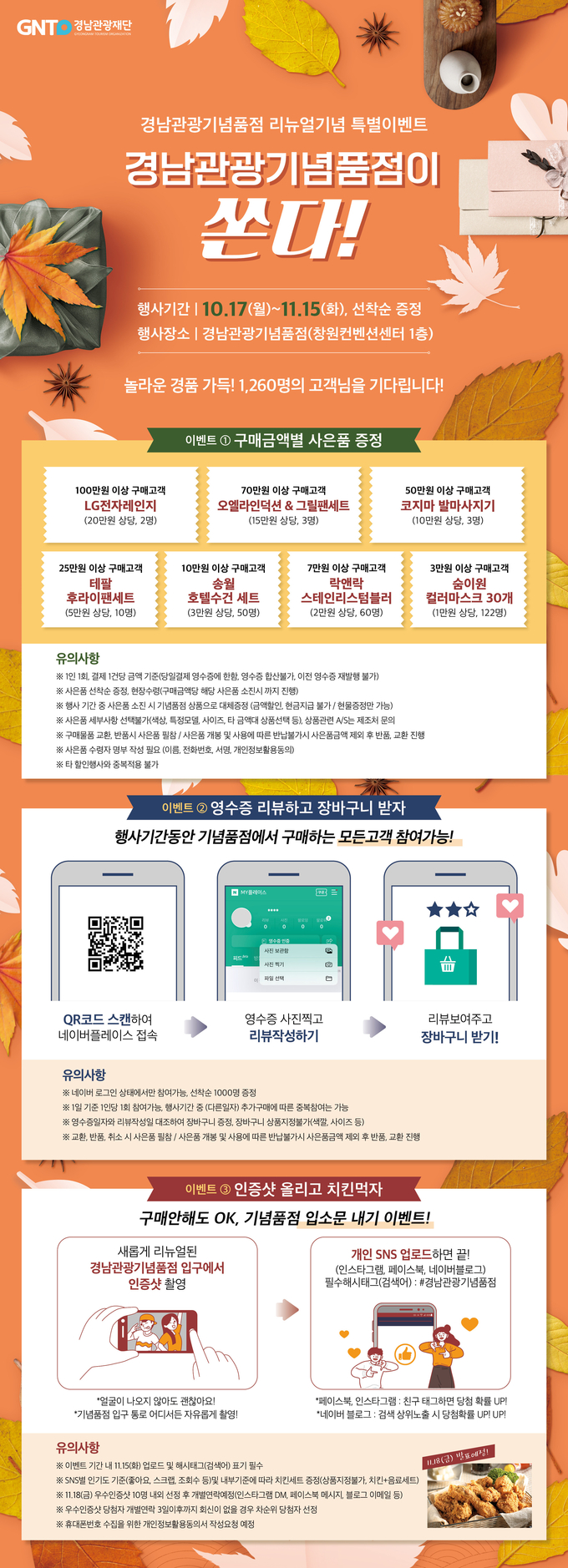 이벤트에 대한 자세한 참여방법과 유의사항은 첨부된 홍보포스터와 경남관광기념품점 누리집(www.gntostore.kr), 전화(055-212-1340)로 확인할 수 있다.