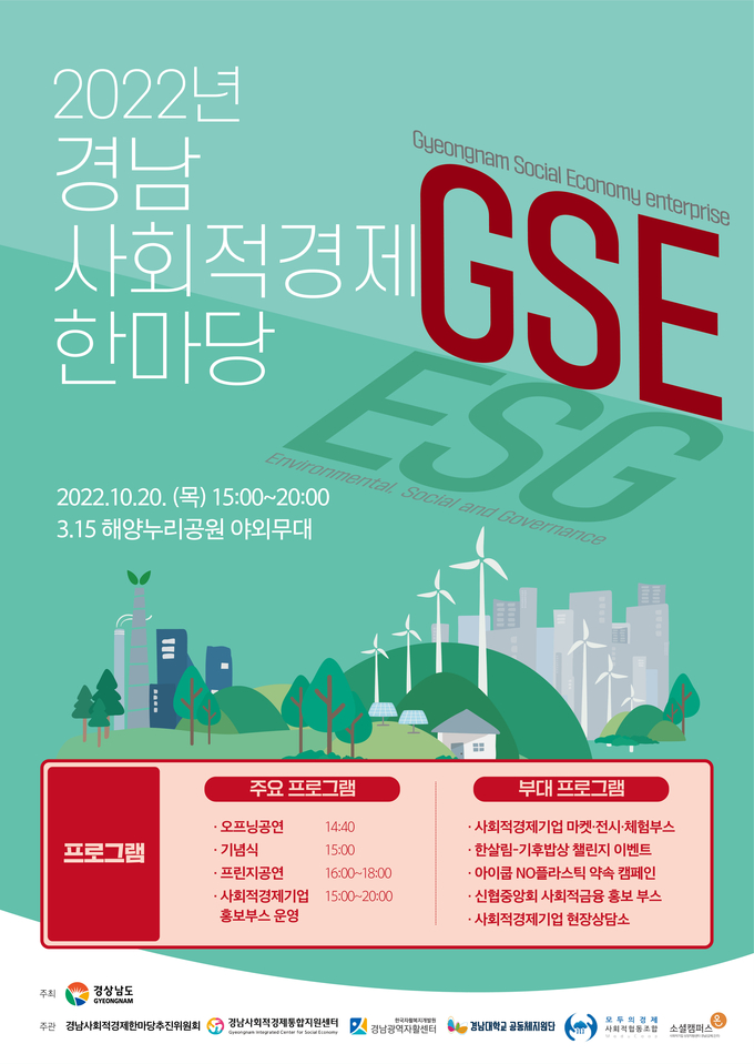 [경남도민뉴스] 경상남도(지사 박완수)는 오는 20일 경남도의 사회적경제 관계자 300여 명이 참여하는 ‘2022년 경남사회적경제 한마당’ 행사를 마산해양누리공원에서 개최한다.