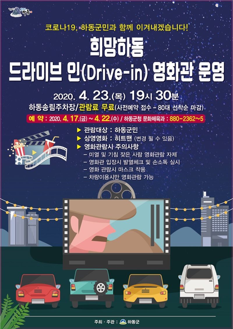 ‘희망하동 드라이브 인 영화관’은 23일 오후 7시 30분 송림 주차장에서 열리며, 군민이 타인과 접촉하지 않고 무료로 영화를 관람할 수 있도록 선착순 80대 예약을 받아 ‘히트맨’을 상영한다.