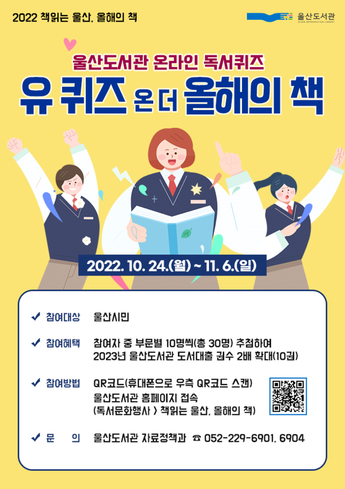 참여 방법은 울산도서관 누리집(library.ulsan.go.kr)에 접속하거나 울산도서관에서 배포하는 웹 배너 등 홍보물에 있는 정보 무늬(QR 코드)를 통해 별도 제작된 독서퀴즈 웹페이지에 접속하면 된다.