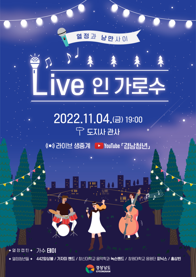 [경남도민뉴스] 경남도는 11월 4일 금요일 저녁 7시부터 9시까지 2시간 동안 도지사 관사 옆 야외무대에서 경남청년 콘서트 ‘Live 인 가로수’를 개최한다고 밝혔다.