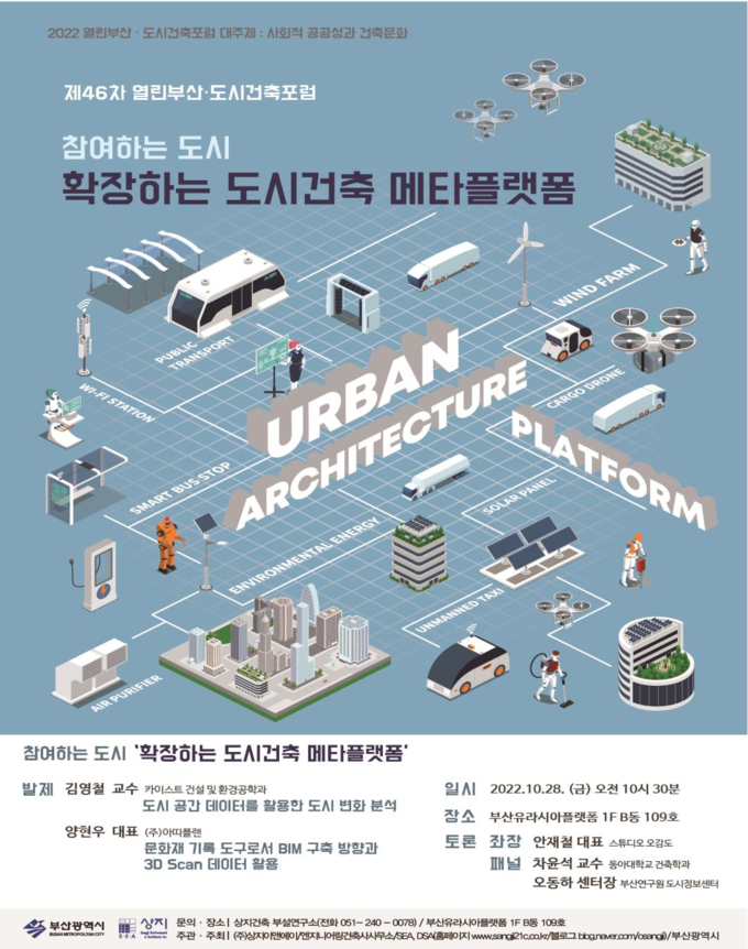 [경남도민뉴스] 부산시(시장 박형준)는 오는 10월 28일 오전 10시 30분 부산유라시아플랫폼 1층 B동 109호에서 ‘제46차 열린부산·도시건축포럼’을 개최한다고 밝혔다.